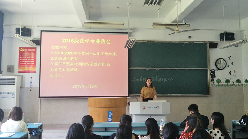 5月28日,16级法学专业于行知楼2020104召开贫困生认定暨资助诚信教育主题班会。本次会议由16法学专业辅导员储梦凡主持,16法学专业全体同学出席参加。