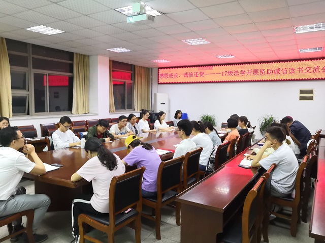 5月18日晚,2017级法学专业于36365线路检测中心行政楼会议室召开了资助诚信读书交流会,会议由辅导员李琛主持,部分受国家助学金及助学贷款资助的同学参加。