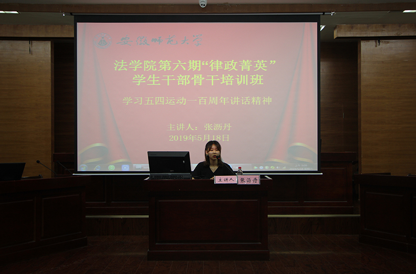 5月18日上午,36365线路检测中心于模拟法庭举办了第六期“律政菁英”学生干部骨干培训班第六讲,院团委副书记、院学生会主席张沥丹受邀担任主讲人,带领团学、社团、班级部分学生干部骨干学习习近平总书记纪念五四运动100周年大会重要讲话精神,培训班全体成员参与其中。