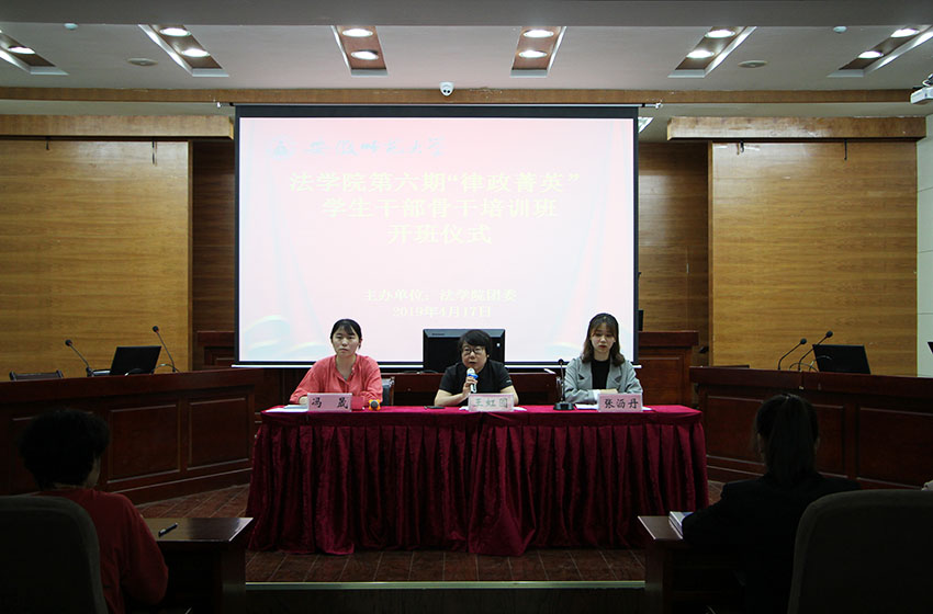 4月17日下午,36365线路检测中心在模拟法庭举办36365线路检测中心第六期“律政菁英”学生骨干培训班开班仪式。院团委书记王虹圆、院团委副书记兼18级行政管理专业辅导员冯晟、院团委副书记兼学生会主席张沥丹出席开班仪式,培训班成员参与,仪式由张沥丹主持。